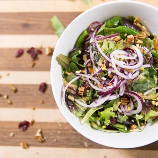 - In a large bowl, add your salad mix, apples, onion, pecans, cranberries and toss well