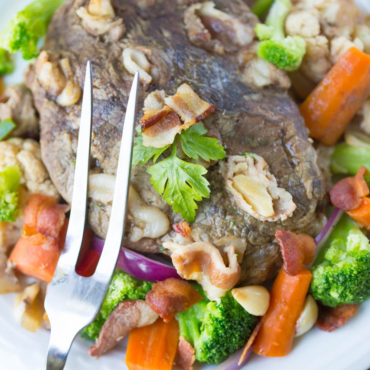 - Using a thin knife create about 12 holes deep into the meat about 1/2 inch wide, you need to be able to fit some garlic and bacon in the hole