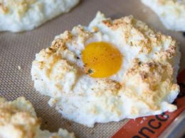 - Place the egg nests in the oven for 3 minutes, pull them out and then add a yolk into the center of each egg nest