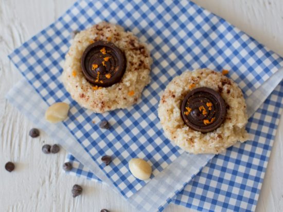 Wow, so what a week it has been already. As most of you know, I am normally not one to complain, but there might be some eeeekkksss or ooooohhhhss while I type this post. As amazing of a week as it has been, with the launch of my Ebook with The Fat Burning Man (which you can check out by clicking above), it didn’t end so lovely. I was unfortunately involved in a car accident courtesy of the awesome people in front of me that were texting and driving and not paying attention. They slammed on their brakes going from 50 to 0 and I was left with the decision to either hit them or go curb hopping. I chose the curb which had the lovely result of smashing my head into my drivers side window while I used the side of the other car to slow me down. To make a long story short, I am ok besides being angry for being at fault for someone else’s negligence with their cell phone. I had x-rays and all that jazz done, and I just have a horrible case of whiplash. Actually, I would probably get hit by the doctor for sitting here typing this, but I am stir crazy not being able to do much. Luckily, I had this recipe waiting to share with you and all I had to do was type and share. Without further adieu, I bring you these yummy Macadamia Thumbprint Cookies from the new Paleo cookbook.