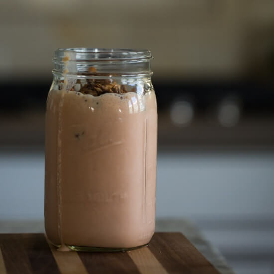 - Pour your smoothie into a mason jar and sprinkle caveman crunch on top