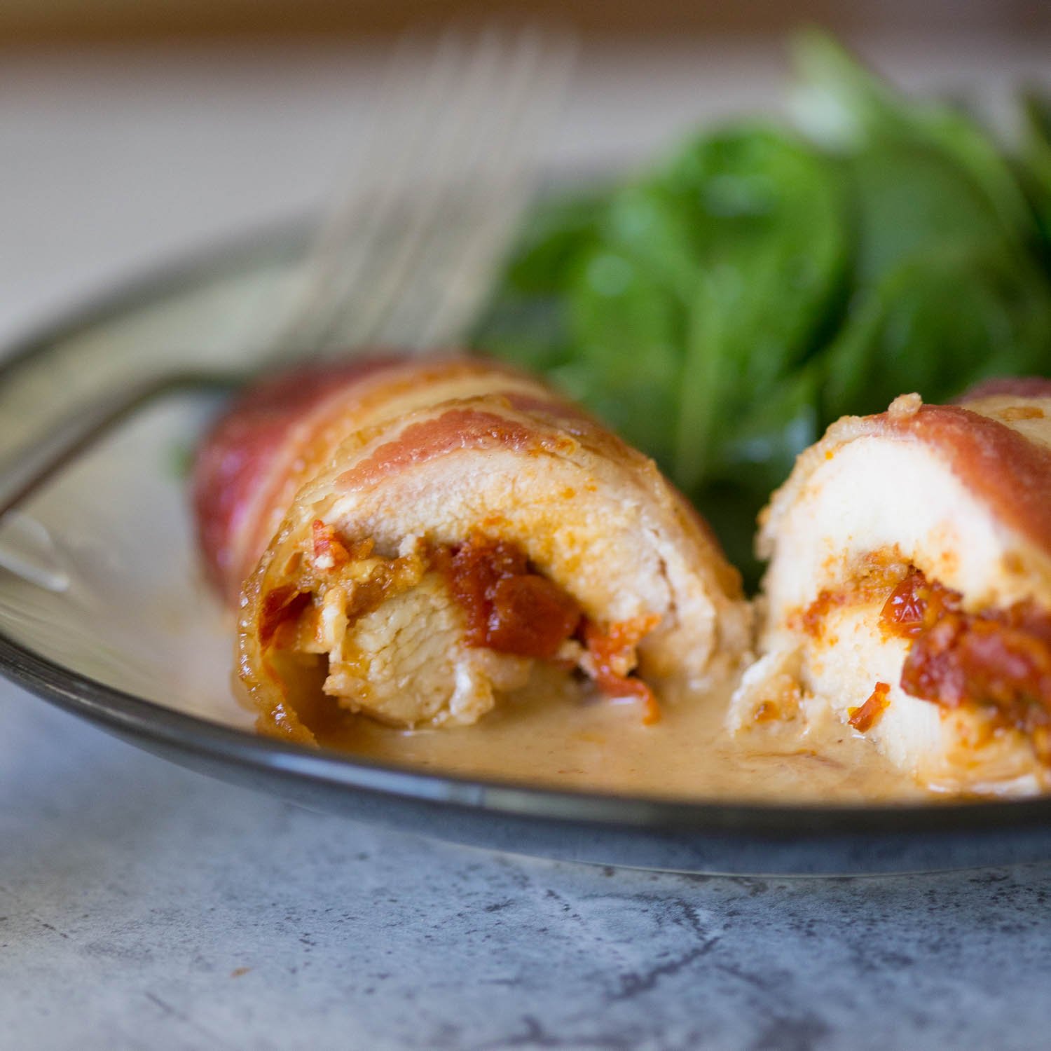 - Fold the chicken breasts closed back onto itself and wrap two slices of bacon around each chicken breast