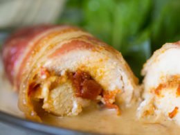 - Remove your chicken, set your oven to broil on high and then place your chicken on the top shelf of your oven for 5-10 minutes to get your bacon nice and brown