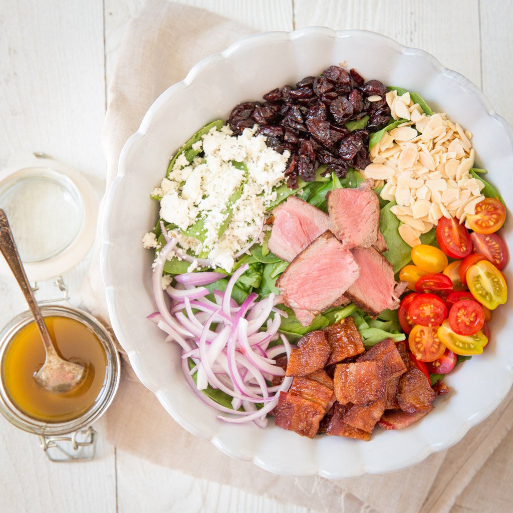 I get scorned a lot for not having salad recipes. Honestly it is because I rarely ever eat them. That used to be the case until I decided to get a little adventurous and started throwing all of my favorite foods in a bowl with spinach. That pretty much means I can make anything a salad. Hence why there is steak, bacon, goat cheese and lots of other goodies in this one. I am thinking about putting a note on all my recipes that states if you want to make a salad, just serve this over greens. Then I can say I have 289 salad recipes including brownie salads, cookie salads, cake salads. Okay that sounds gross, back to this delicious salad that you can modify anyway you like and put together in five minutes, especially if you have delicious leftovers relaxing in the fridge.