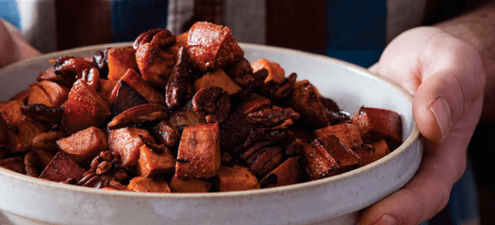 You are here: Home / Recipes / Smoky Candied Bacon Sweet Potatoes – Celebrations Cookbook Review