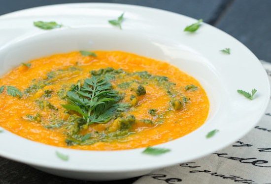 Carrot Soup with Carrot Top Garlic Pesto