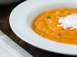 - Transfer your soup to a serving bowl, sprinkle with some fresh thyme leaves and top with some coconut milk